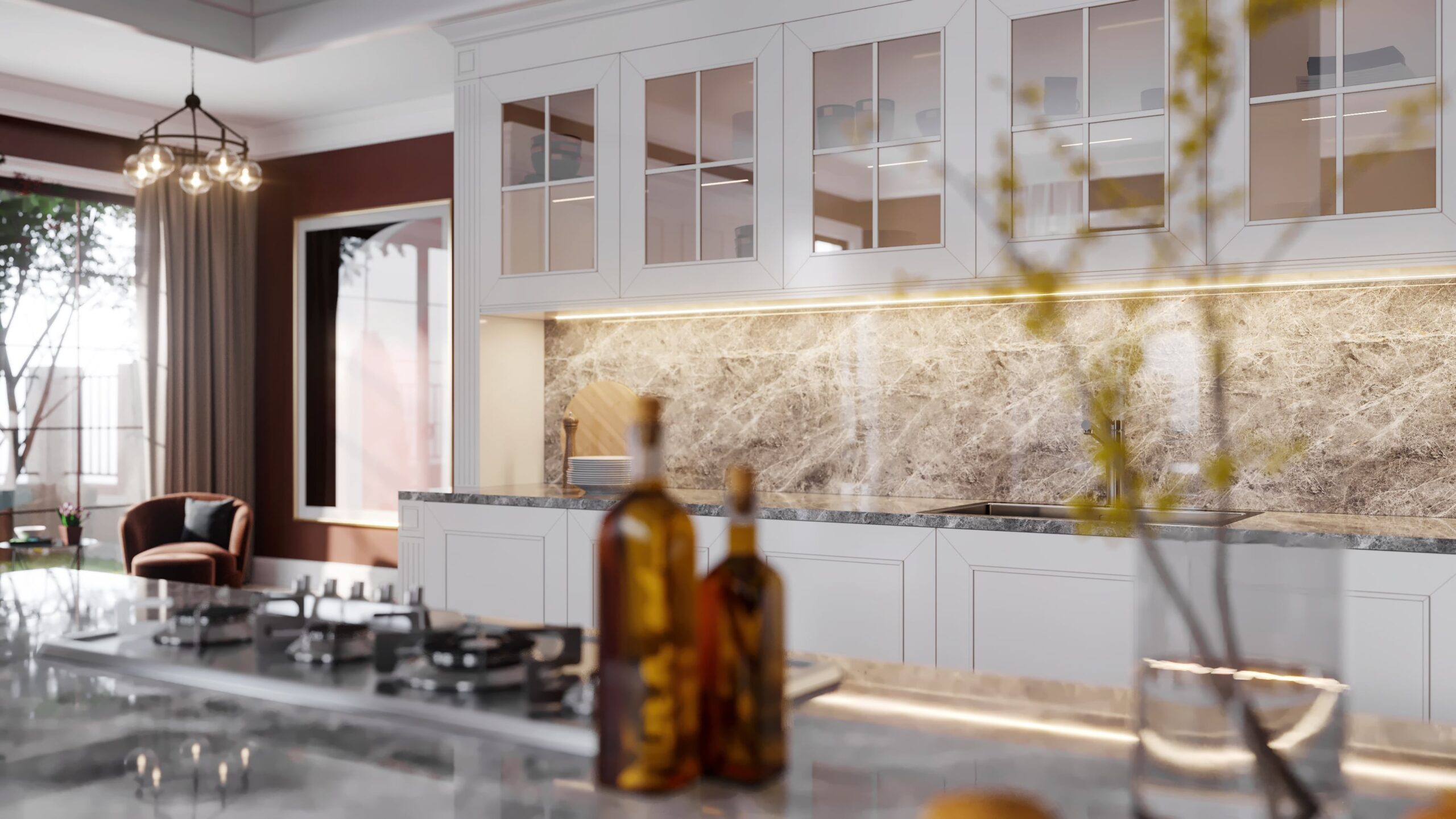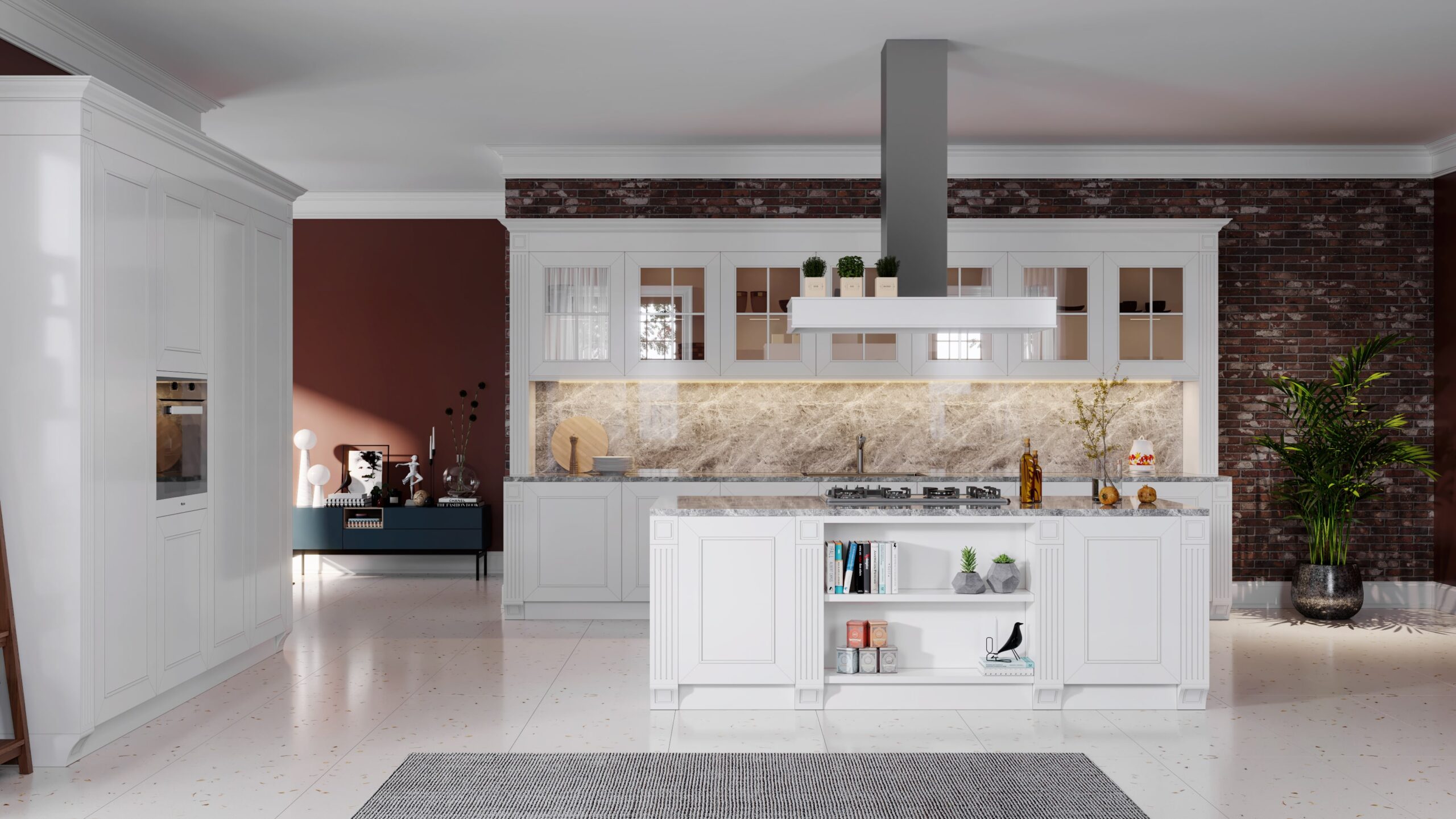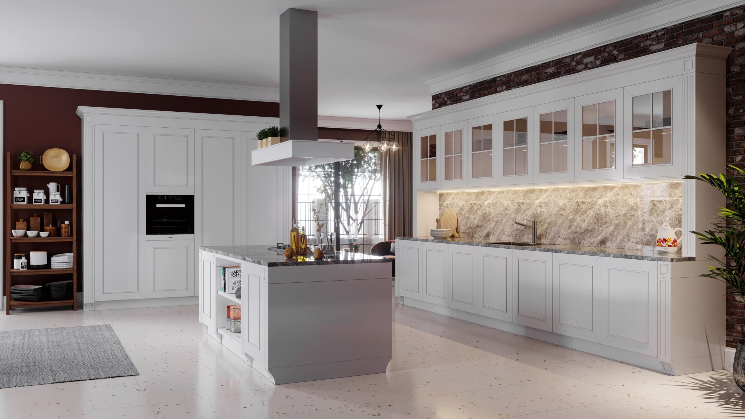 Helios mutfağı, klasik ve zarif çizgileri ile geçmişten ilham alarak modern bir dokunuş sunar. Parlak beyaz dolaplar ve mermer detayları ile geniş, ferah bir atmosfer yaratır. Şıklığı ve işlevselliği bir araya getirir.